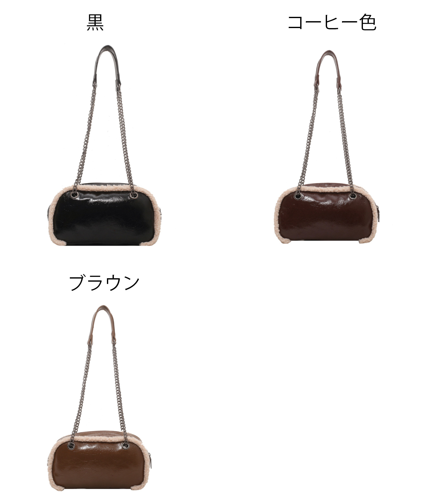 上品なレザー調の質感とふわふわボアの組み合わせが可愛らしく、チェーンストラップで肩掛けスタイルを楽しめます。